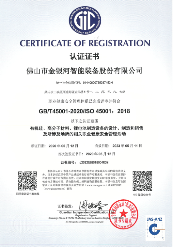 2020年5月,金银河“职业健康安全管理体系”完成评审并符合GB/T45000-2020/ISO 45001:2018,认证范围包括有机硅、高分子材料、锂电池制造设备的设计、制造和销售及所涉及场所的相关环境管理活动。 金银河严格遵守国家关于职业健康安全方面的法律、法规、安全管理标准和技术规范,履行向国家主管部门和社会的承诺,通过管理水平的提升,提高员工的安全运营意识,规范企业的行为,实现职业健康安全绩效的持续改进,为企业的持续发展保驾护航。