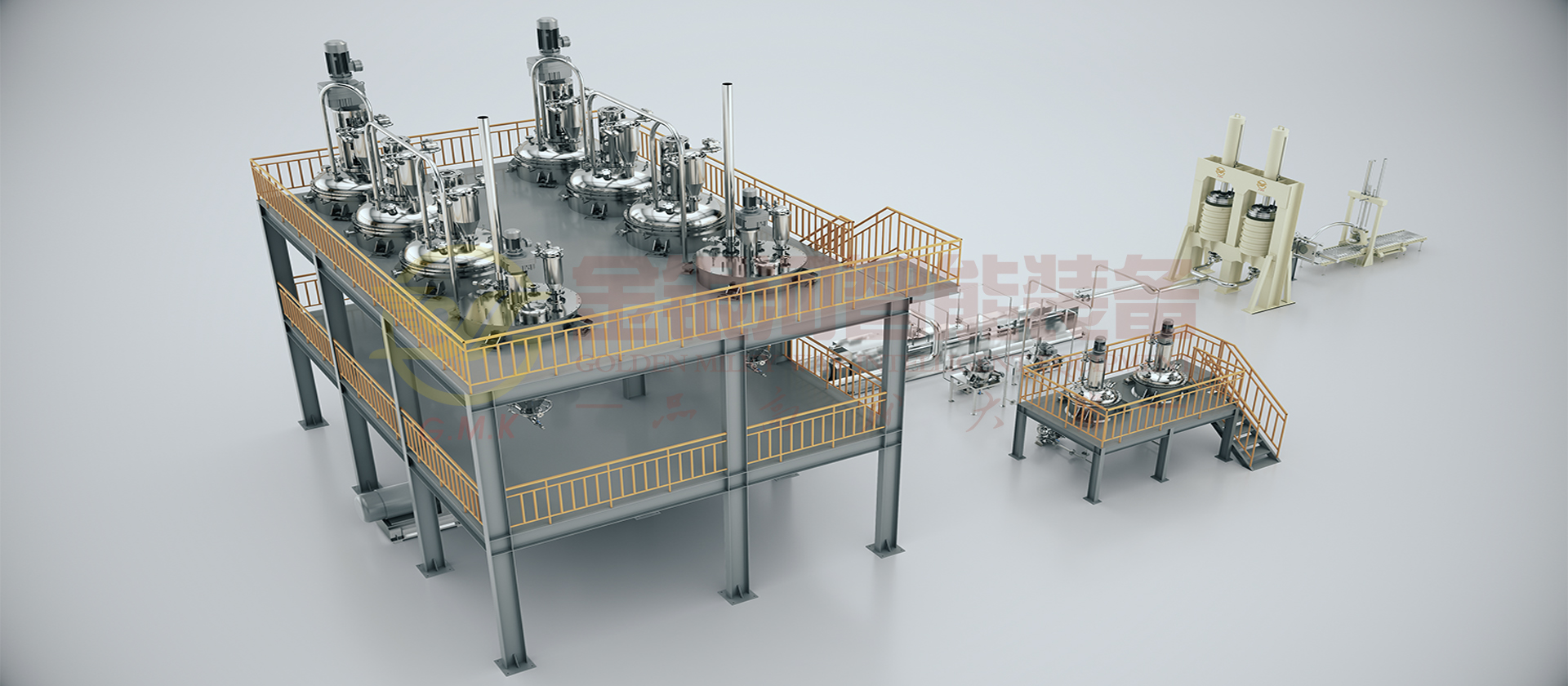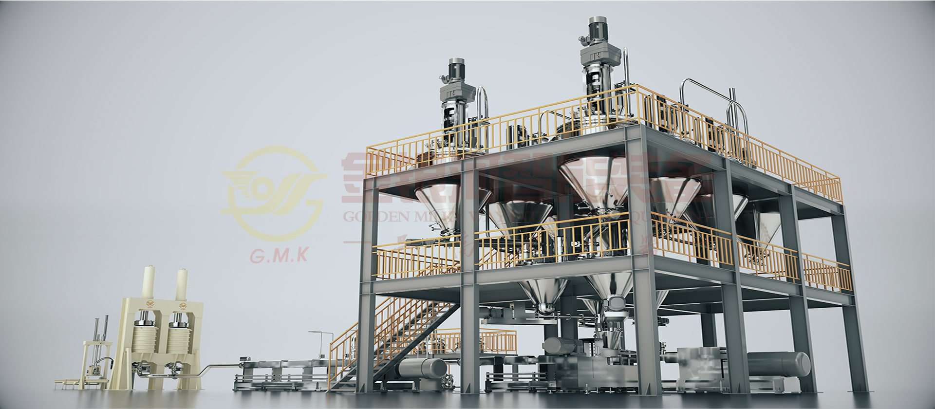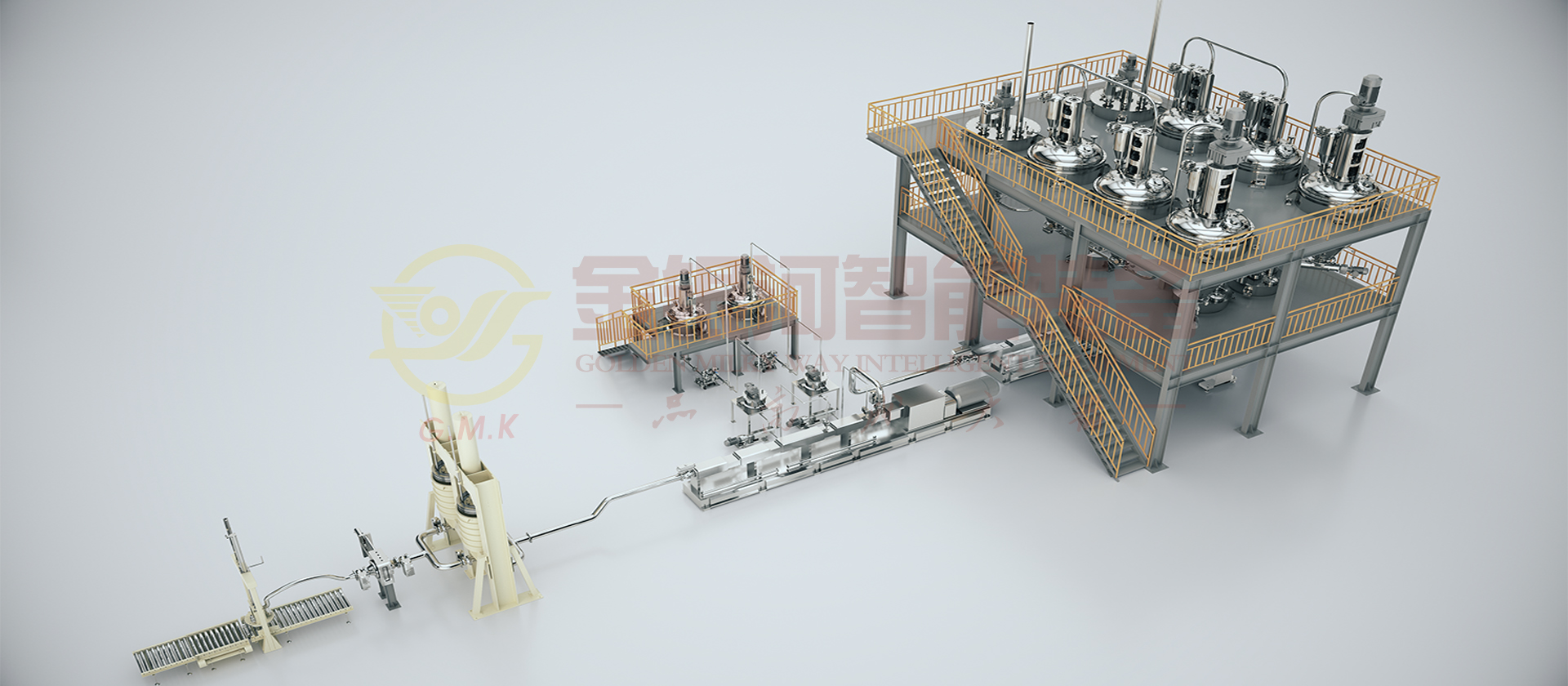 由计量斗、称量及输送系统、贮罐、冷却器、多工位出料机、喂料机、双螺杆螺旋混合机、在线烘干、冷却粉体装置、辅助设备及DCS中央控制系统组成。原材料(粉体与液体)通过精确的计量系统在线自动和连续输送到螺旋混合机中,在一阶螺旋混合机中完成混合、分散、研磨、抽真空等产出基料后入二阶螺旋混合机,通过在线加入助剂至其中,再次完成混合、分散、研磨、抽真空等完成品料制作并输出进入多工位出料机暂存,多工位机出料机轮流交替出料过滤包装。它的生产效率高,适合大规模生产;它具有自动化程度高,杜绝物料直接接触空气,产品质量稳定性好,物料及能源损耗少等优点。